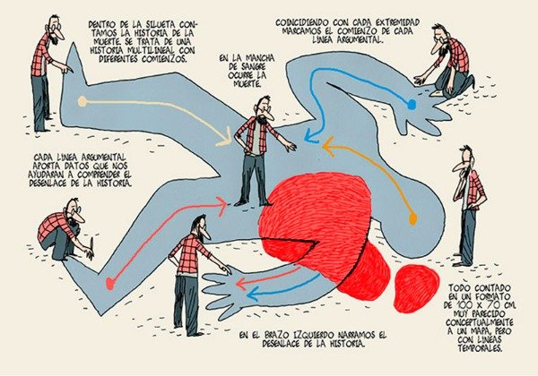 El libro contenía varios relatos ilustrados cuyos argumentos y acciones confluían en un mismo momento. Las mismas historias se incorporaban en un desplegable ilustrado a modo de mural, plegado en un sobre adherido a la contracubierta, que ofrecía una historieta experimental confeccionada con los mismos argumentos pero expresados mediante viñetas que, tras su ordenación y confluencia en una zona del desplegable, daban forma al cuerpo abatido por un disparo al que hace referencia el título.