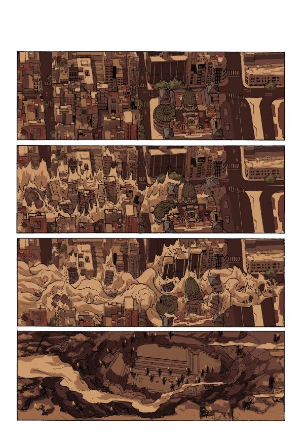 "Ciudad de Buenos Aires. En la Plaza Flores, las obras de extensión de las líneas de subterráneos avanzan. Unos obreros trabajan en la excavación. En el piso, una grieta comienza a abrirse, la gente corre espantada, algunos quedan atrapados. Pronto se convierte en un agujero que devora toda la plaza. El resultado es una depresión sobre el suelo que tiene forma de pirámide invertida."
